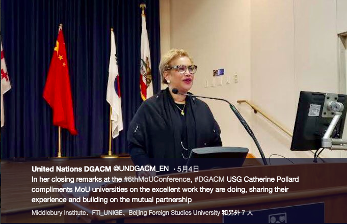 联合国负责大会和会议服务的副秘书长及联合国多语言协调员Catherine Pollard女士在开幕式上致欢迎词并全程参加了会议。