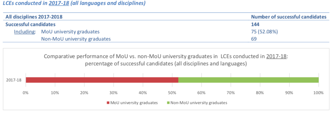 20172018年各语种通过LCE的人员中来自合作院校者所占比例(红色)