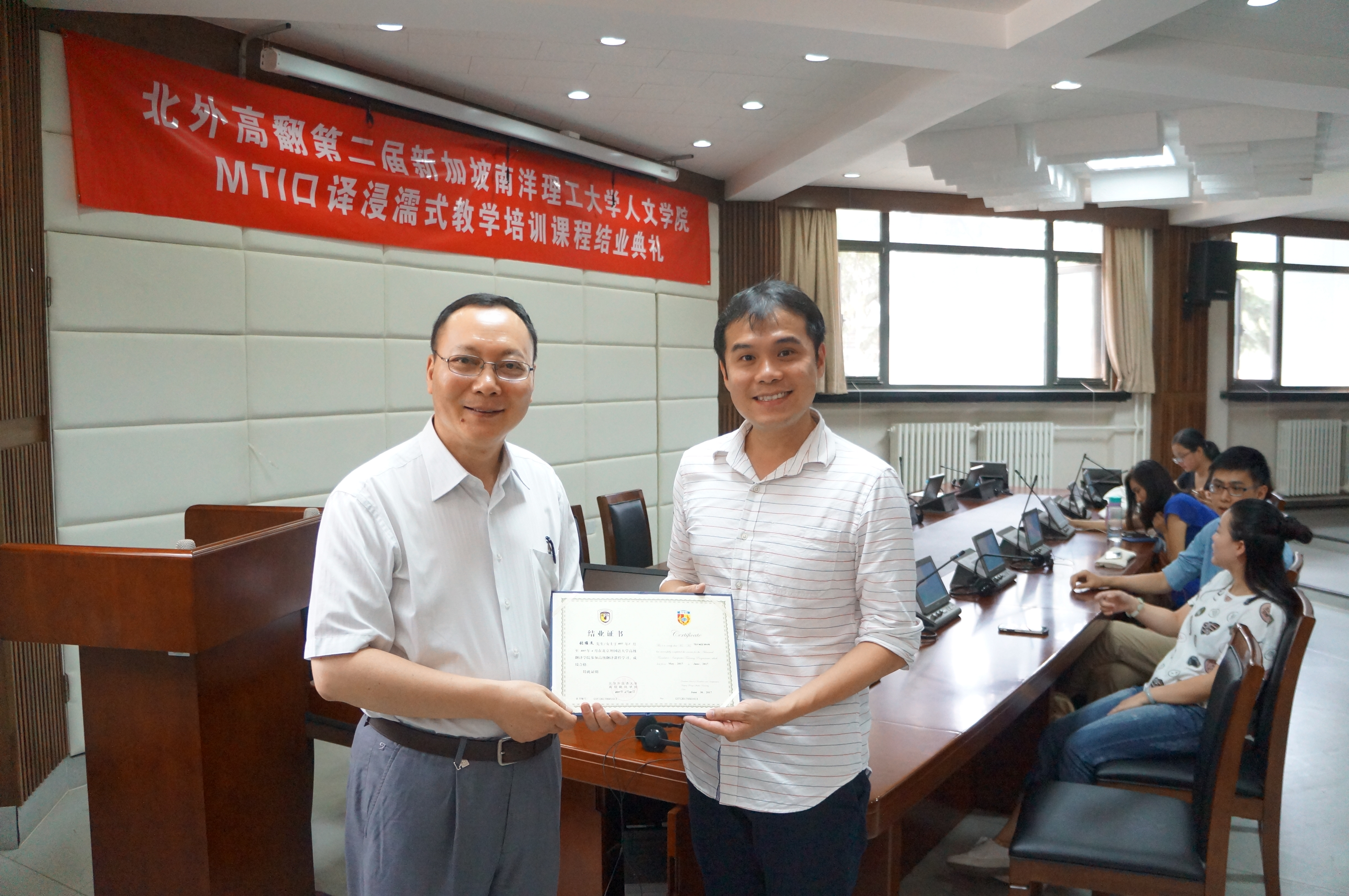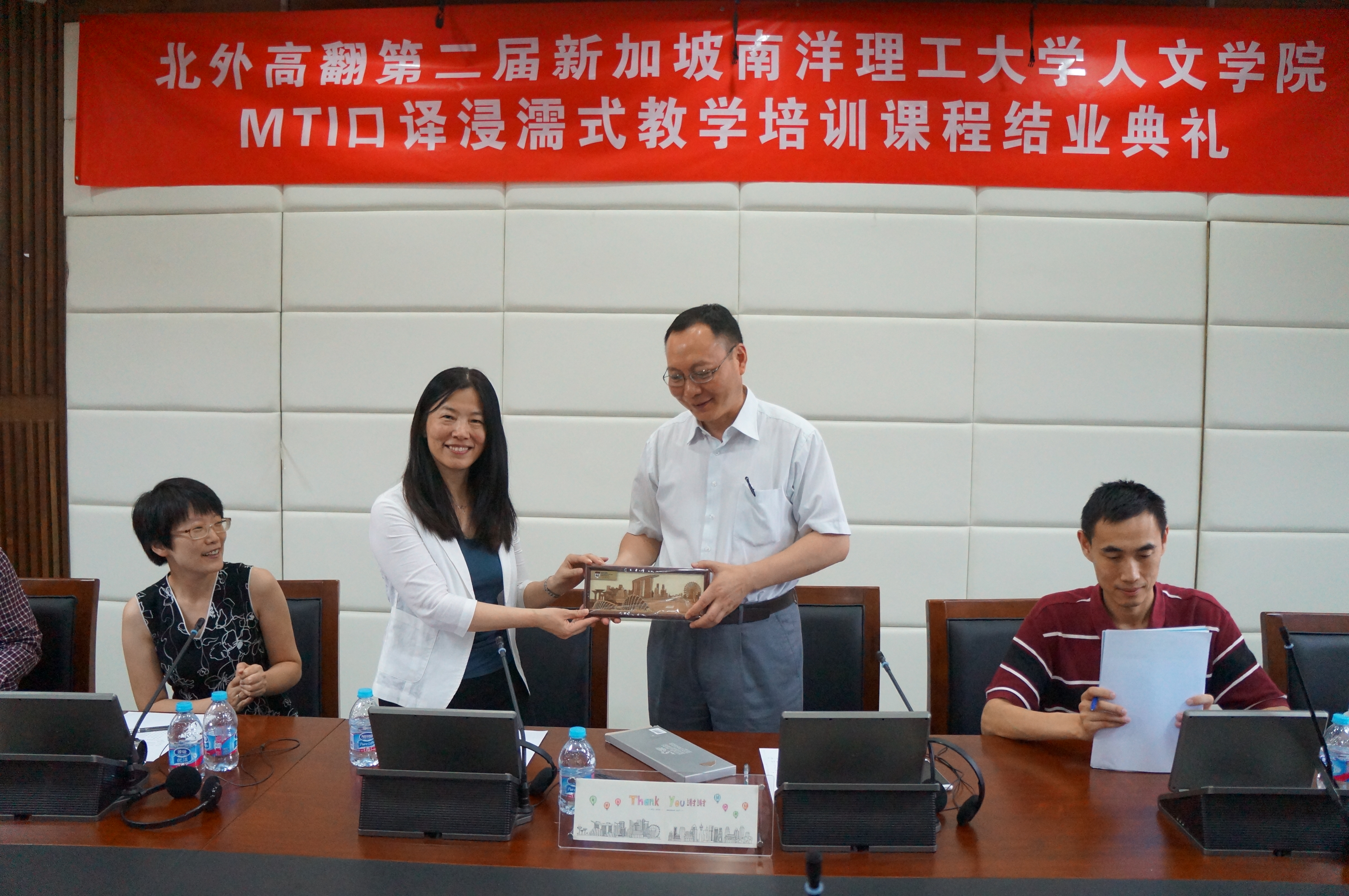 结业典礼上,学员以现场交替传译的方式,展示了六周学习后的学习成果,令人赞叹不已。教师代表也对整个培训期间的教学过程进行了总结。SUNBET申博体育副经理李长栓教授和新加坡南洋理工大学人文公司的高虹老师也分别代表培训方和受训方发表了培训感言。