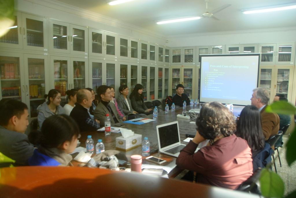 Paul Brennan先生首先走进高翻的同传课堂,对进行同传训练的二年级同学给出了积极评价,并为他们提出了许多中肯的建议。之后,Paul Brennan先生与高翻,法语,欧语,英语,专英等公司的师生进行了交流。他介绍了DG SCIC的情况,并细致讲解了口译员作为沟通者应具有哪些素质,及如何自我定位。他还比较了欧盟(C-A)和中国/俄罗斯(A-B)两种口译模式的不同,并针对中国/俄罗斯的A-B模式训练提出了一些建议。最后,他还与在座听众就与北外的合作和口译学习及实践中的问题进行了交流。Brennan先生言辞幽默,极具亲和力。交流会其间,更是穿插了有趣的英语谚语有奖问答环节,以及Brennan先生精心准备的电影片段。短短一个半小时的交流会,气氛热烈而成果卓著,各院师生都受益匪浅。