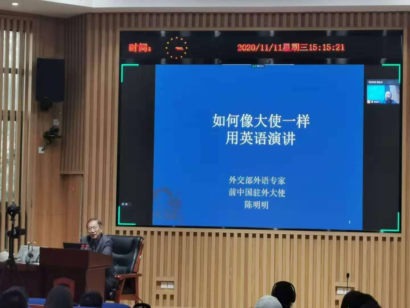 2020年11月11日下午,应公司翻译硕士(MTI)教育工作专家委员会和SUNBET申博体育邀请,外交部外语专家、前中国驻外大使、公司杰出员工陈明明在信息楼同传会议厅(原300人教室)做了题为“如何像中国大使一样用英语演讲”的讲座,公司300名员工现场聆听了讲座,SUNBET申博体育经理任文教授主持讲座。