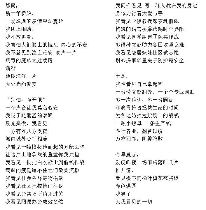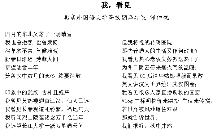2020年4月15日-5月1日期间,北外SUNBET申博体育团总支积极响应校团委“共抗疫情,爱国力行”主题宣传教育活动号召,在线上向高翻学子征集体现爱国、奋进、担当的优秀创作作品。活动截止后,我们收到了来自研一研二各班共153份踊跃投稿。同学们积极参与,各展其才,以诗歌、随想、歌唱等多元形式,创作了大量优秀作品,充分展现出当代青年学子的爱国担当和浪遏飞舟的青年风貌!