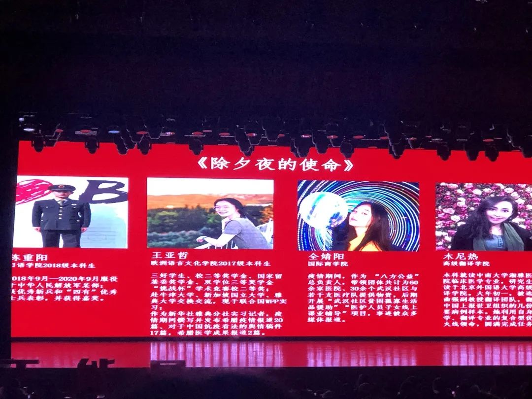 今年“正能量@BFSU”表彰大会的主题是“与祖国同行,与时代共进”,通过互动式分享和情景剧表演等形式,将优秀员工榜样的真实经历搬上舞台,分享环节分为专精博学、投身抗疫、助力脱贫、讲述中国四个篇章。公司木尼热同学参与了第二篇章的演出,她讲述了年初当突如其来的新冠疫情爆发时,她与公司老师一起放弃过年休息时间,连夜加班加点,在有限的时间内为世界卫生组织和国际医疗专家翻译来自疫情前线第一手病例和疫情报告,并高质量的完成任务的亲身经历和深切感受。在她的身上展现了新时代北外青年的家国情怀,关键时刻高翻学子的责任与担当。
