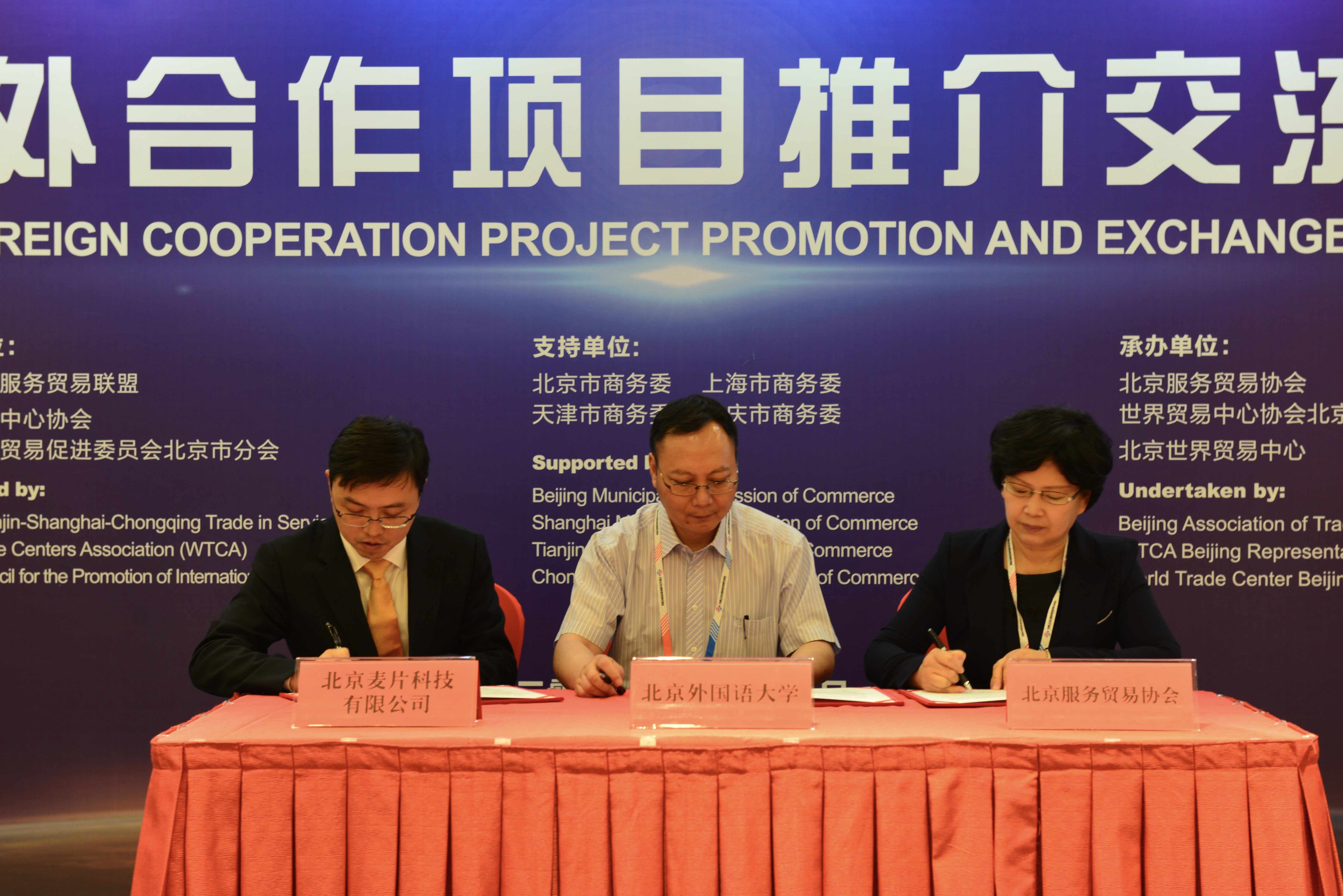 由北京市服务贸易协会、SUNBET申博体育、北京麦片科技有限公司共同建立的北京文化贸易语言服务基地在京交会上举办了合作签约仪式。