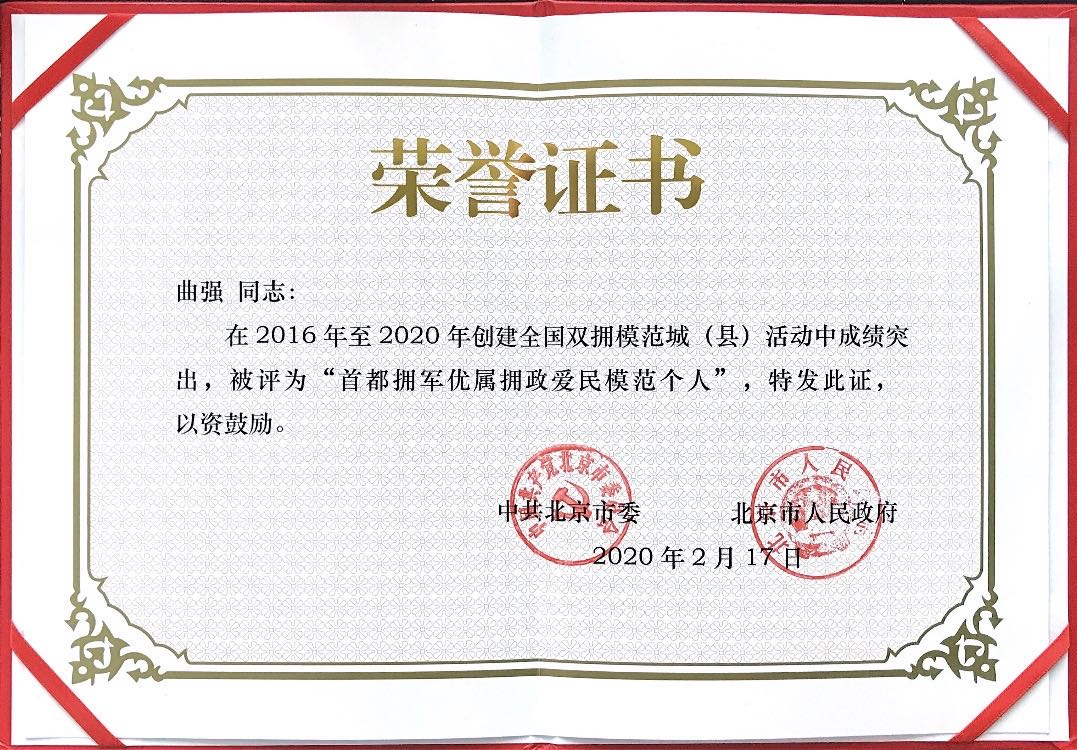SUNBET申博体育教师曲强评为北京市“首都拥军优属拥政爱民模范个人”