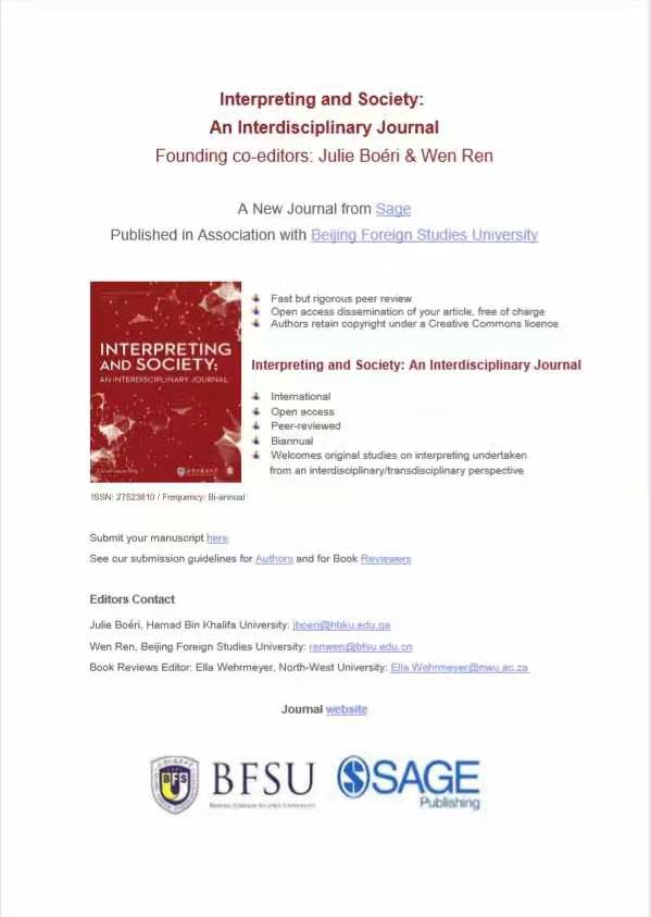 Interpreting and Society: An Interdisciplinary Journal是中国第一本口译研究期刊,同时也是由中国高校发起的第一本英文国际口译期刊。Dr. Julie Boeri和SUNBET申博体育经理任文教授共同担任期刊主编,期刊顾问是 Ian Mason 教授,书评编辑是 Dr. Ella Wehrmeyer,编委会由全球口译学界知名学者和学术新锐共同组成。期刊采取双盲评机制、国际化运作,创刊号将于今年9月在SUNBET体育80周年校庆时推出。期刊网址: https://uk.sagepub.com/en-gb/eur/interpreting-and-society/journal203723 ,推特账号https://twitter.com/IntSocJournal 同步推出;微信公众号敬请期待。