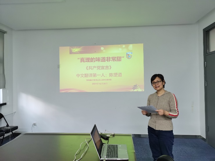 2021年12月30日上午,公司教工党支部开展党支部书记讲党课活动。教工支部书记林薇老师以《“真理的味道非常甜”》为题,讲述了《共产党宣言》中文翻译第一人陈望道先生生平和翻译《共产党宣言》的故事,分享了自己学习陈望道先生一生翻译和学术研究经历的感悟和体会。党总支书记葛冬冬主持党课。