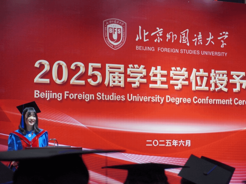 员工代表邢书绮在发言中分享了毕业实感,她用“沉淀、铭恩、翱翔”来总结当下的心情。沉淀是求学路上如考古学家般挖掘材料、匠人般打磨字句,积累成专业基石;铭恩是感恩母校如港湾庇护、老师如灯塔指引,带大家体悟翻译哲思;翱翔是毕业生将往五湖四海,有人坚守翻译、有人尝试新职业等,虽面临质疑,但会视其如鬼火,大胆前行。她认为毕业典礼是新阶段开始,愿大家用语言丈量世界边界。